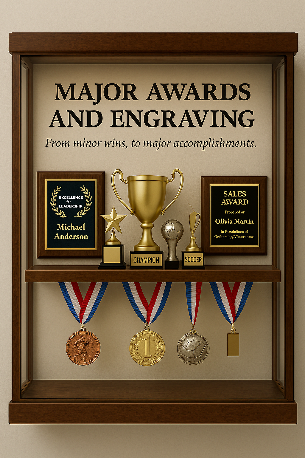 Major Awards and Engraving is here to help you celebrate every success — from minor wins, to major accomplishments. Whether it’s custom plaques, shining medals, or timeless trophies, we’ve got the perfect way to honor achievement.